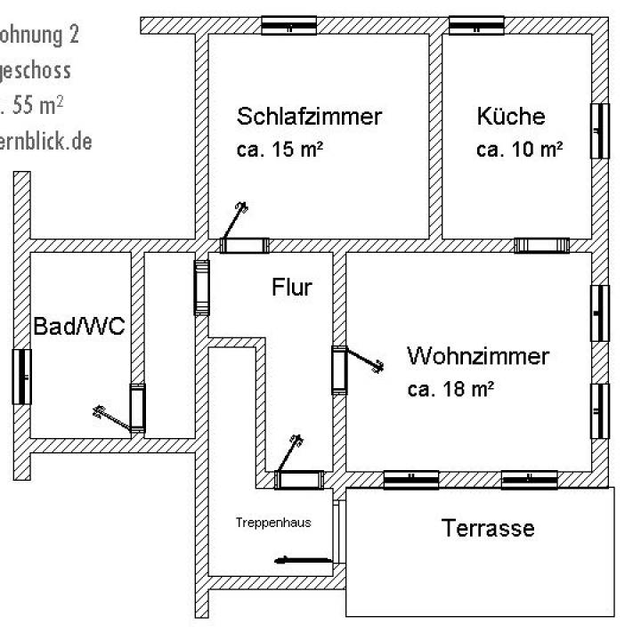Ferienwohnung mit ca. 55 qm geeignet für 2-3 Personen im Erdgeschoß. Sie besteht aus einer komplett ausgestatteter Küche, 1 Schlafzimmer mit Doppelbett, Bad mit Dusche Badewanne und WC. Wohnzimmer mit Schlafcouch SAT-TV und Radio. Auch eine Terrasse vor der Wohnung kann genutzt werden.